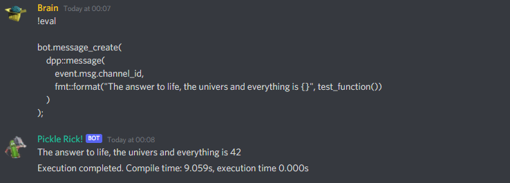g++ installed on your server and in your ${PATH}.!eval exit(0); and make the bot quit, for example, or delete files from the host operating system, if misused or misconfigured.To create this program you must create two files, eval.h and eval.cpp. The header file lists forward declarations of functions that you will be able to use directly within your eval code. As well as this the entirety of D++ will be available to the eval command via the local variable bot, and the entire on_message_create event variable via a local variable called event.