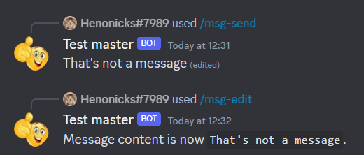 #include <dpp/dpp.h> int main() { /* the second argument is a bitmask of intents - i_message_content is needed to get messages */ dpp::cluster bot("Token", dpp::i_default_intents | dpp::i_message_content); bot.on_log(dpp::utility::cout_logger()); /* The event is fired when someone issues your commands */ bot.on_slashcommand([&bot](const dpp::slashcommand_t& event) { if (event.command.get_command_name() == "msg-send") { event.reply("That's a message"); } else if (event.command.get_command_name() == "msg-edit") { const auto content = std::get<std::string>(event.get_parameter("content")); /* get the message to edit it after. here string will automatically be converted to snowflake */ const dpp::snowflake msg_id = std::get<std::string>(event.get_parameter("msg-id")); bot.message_get(msg_id, event.command.channel_id, [&bot, content, event](const dpp::confirmation_callback_t& callback) { if (callback.is_error()) { event.reply("error"); return; } auto message = callback.get<dpp::message>(); /* change the message content and edit the message itself */ message.set_content(content); bot.message_edit(message); event.reply("Message content is now `" + content + "`."); }); } }); bot.on_ready([&bot](const dpp::ready_t& event) { if (dpp::run_once <struct register_global_commands>()) { dpp::slashcommand msg_edit("msg-edit", "Edit a message sent by the bot", bot.me.id); msg_edit.add_option(dpp::command_option(dpp::co_string, "msg-id", "ID of the message to edit", true)); /* true for required option */ msg_edit.add_option(dpp::command_option(dpp::co_string, "content", "New content for the message", true)); /* same here */ dpp::slashcommand msg_send("msg-send", "Send my message", bot.me.id); bot.global_bulk_command_create({ msg_edit, msg_send }); } }); bot.start(dpp::st_wait); return 0; }
