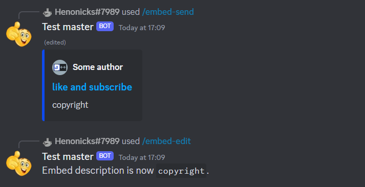 #include <dpp/dpp.h> int main() { /* the second argument is a bitmask of intents - i_message_content is needed to get messages */ dpp::cluster bot("Token", dpp::i_default_intents | dpp::i_message_content); bot.on_log(dpp::utility::cout_logger()); /* The event is fired when someone issues your commands */ bot.on_slashcommand([&bot](const dpp::slashcommand_t& event) { if (event.command.get_command_name() == "embed-send") { dpp::embed embed = dpp::embed() .set_color(dpp::colors::sti_blue) .set_title("like and subscribe") .set_url("https://dpp.dev/") .set_author("Some author", "https://dpp.dev/", "https://dpp.dev/DPP-Logo.png") .set_description("Creator is <creator name>"); event.reply(embed); } else if (event.command.get_command_name() == "embed-edit") { const auto description = std::get<std::string>(event.get_parameter("desc")); /* get the message to edit its embed after. here string will automatically be converted to snowflake */ const dpp::snowflake msg_id = std::get<std::string>(event.get_parameter("msg-id")); bot.message_get(msg_id, event.command.channel_id, [&bot, description, event](const dpp::confirmation_callback_t& callback) { if (callback.is_error()) { event.reply("error"); return; } auto message = callback.get<dpp::message>(); auto& embeds = message.embeds; /* change the embed description and edit the message itself. * since we're using a reference, what changes in embeds changes in message.embeds */ embeds[0].set_description(description); bot.message_edit(message); event.reply("Embed description is now `" + description + "`."); }); } }); bot.on_ready([&bot](const dpp::ready_t& event) { if (dpp::run_once <struct register_global_commands>()) { dpp::slashcommand embed_send("embed-send", "Send my embed", bot.me.id); dpp::slashcommand embed_edit("embed-edit", "Edit an embed sent by the bot", bot.me.id); embed_edit.add_option(dpp::command_option(dpp::co_string, "msg-id", "ID of the embed to edit", true)); /* true for required option */ embed_edit.add_option(dpp::command_option(dpp::co_string, "desc", "New description for the embed", true)); /* same here */ bot.global_bulk_command_create({ embed_send, embed_edit }); } }); bot.start(dpp::st_wait); return 0; }