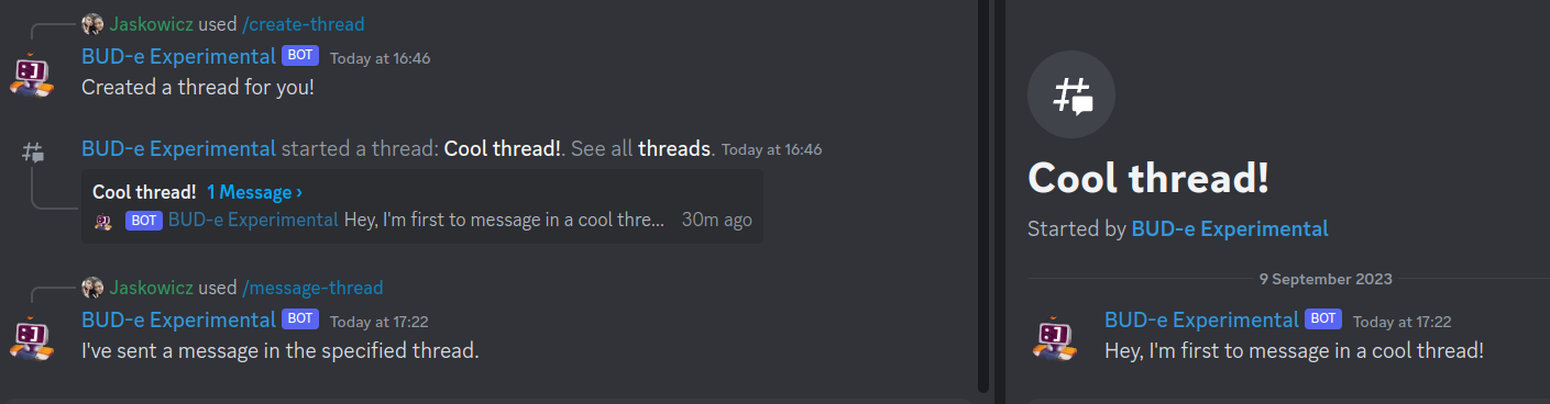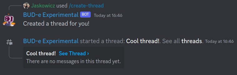 #include <dpp/dpp.h> int main() { /* Create the bot */ dpp::cluster bot("token"); bot.on_log(dpp::utility::cout_logger()); /* The event is fired when the bot detects a message in any server and any channel it has access to. */ bot.on_slashcommand([&bot](const dpp::slashcommand_t& event) { /* Check which command they ran */ if (event.command.get_command_name() == "create-thread") { /* Here we create a thread in the current channel. It will expire after 60 minutes of inactivity. We'll also allow other mods to join, and we won't add a slowdown timer. */ bot.thread_create("Cool thread!", event.command.channel_id, 60, dpp::channel_type::CHANNEL_PUBLIC_THREAD, true, 0, [event](const dpp::confirmation_callback_t& callback) { if (callback.is_error()) { event.reply("Failed to create a thread!"); return; } event.reply("Created a thread for you!"); }); } }); bot.on_ready([&bot](const dpp::ready_t& event) { if (dpp::run_once<struct register_bot_commands>()) { /* Create and register the command */ bot.global_command_create(dpp::slashcommand("create-thread", "Create a thread!", bot.me.id)); } }); bot.start(dpp::st_wait); return 0; }